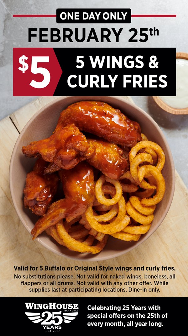 The Winghouse On Twitter Don T Miss Our Second 25th Anniversary Celebration Next Monday Feb 25th Where You Can Get Five Wings And Curly Fries For Only 5 Come Party With Winghouse Https T Co Pv5smwlgbb